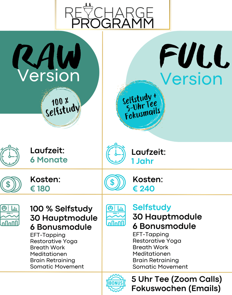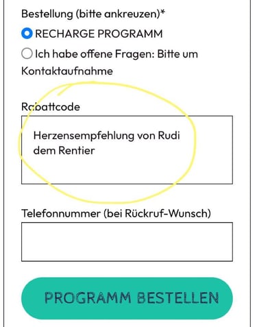 Falls das RECHARGE Programm gewinnbringend und unterstützend für dich war, kannst du das RECHARGE Programm gerne weiterempfehlen und bekommst bei Zustandekommen eines erneuten Kaufes einen Gutschein*
